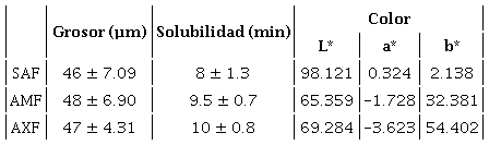 Adicional, se midió el parámetro de color, los resultados concuerdan con los aspectos visuales ya descritos. La película SAF presentó valores de a* y b* cercanos a cero e indica que es incolora y translúcida, mientras que L* con un valor de 98 hace referencia a que es luminosa. Después de la adición de los extractos las películas AMF y AXF mostraron valores correspondientes al color verde (-a) y amarillo (+b), además de baja luminosidad (L*), el cambio en las coordenadas L*a*b* se debe a la presencia de los compuestos fenólicos de los extractos, que además de conferirles color les proporcionan propiedades antioxidantes y de protección ante la radiación UV (Kim et al., 2018; Tedesco et al., 2017).