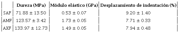 La dureza, módulo elástico y desplazamiento de la indentación a nanoescala, son parámetros relevantes relacionados con la estructura química y propiedades mecánicas de las películas. Los resultados obtenidos (Tabla II) sugieren que la adición de los extractos (AM y AX), disminuyen el desplazamiento de la indentación reflejado en el aumento de la dureza en las películas AMF (42%) y AXF (46%), así como en un incremento del módulo elástico en un 69% (AMF) y un 64% (AXF) respecto a SAF. Si bien es cierto que la incorporación de extractos en las películas poliméricas puede afectar o beneficiar sus propiedades mecánicas (Mir et al., 2018), nosotros observamos que AMF y AXF mejoraron las propiedades de dureza y elasticidad, al mantener su integridad, aspectos importantes para su manipulación, administración, almacenamiento y transporte (Alaei & Omidian, 2021; Pimparade et al., 2017). En otros trabajos también se reporta que la adición de los extractos mejora las propiedades mecánicas de las películas, atribuidas principalmente a la formación de puentes de hidrógeno de los grupos hidroxilo de los metabolitos con los biopolímeros usados (Kaczmarek, 2020; Mir et al., 2018; Torres Vargas, Galeano Loaiza & González, 2021).
