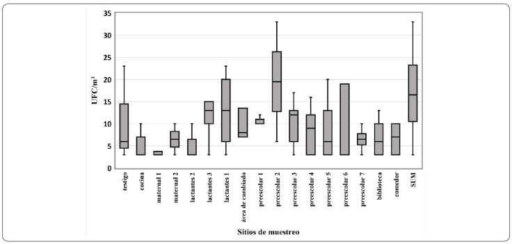 En la Gráfica I se presenta el análisis de las varianzas (ANOVA) de una sola vía, junto con la prueba de Tukey-Kramer (p≤0,05). La cantidad de UFC/m3 encontrada en los sitios muestreados, no mostró diferencia significativa entre las denominaciones de uso de cada uno de ellos. Lo anterior, hace suponer que el CDI no tiene un reservorio de hongos nativos y eso, aunado a los programas de mantenimiento y limpieza que llevan a cabo en el sitio, evitan una propagación que represente un riesgo para la salud de los infantes y usuarios en general, ya que el número de UFC/m3 encontrado, y como se mencionó, es inferior al considerado como un riesgo clínico (Sánchez & Almaguer, 2014). No obstante, es importante tener presente que el estudio se realizó en un clima árido-seco, en donde el uso del aire acondicionado se da, obligadamente, en el periodo escolar de abril a octubre y su operación conduce a la condensación de agua con un aumento de la humedad relativa y la temperatura, favoreciendo el crecimiento de los hongos, lo que conduce a tener una limpieza frecuente de los filtros del aire acondicionado (Haleem & Mohan, 2012).