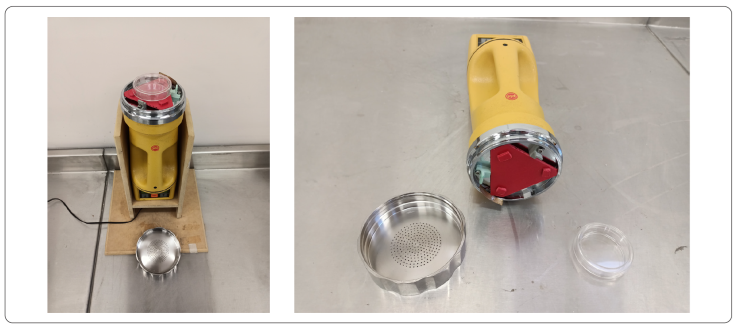 Las muestras se tomaron a un metro de altura con un equipo SAS SUPER 100 (Thomas Scientific), con capacidad de aspiración de 100 L/min, como se muestra en la Imagen I. Para la captura de muestras de aire, se colocó una caja de Petri con medio de cultivo durante 3 minutos (García & Sánchez, 2012). Al término del periodo, la caja se retiró del muestreador y se colocó de inmediato en una hielera con refrigerante. Las cajas inoculadas se trasladaron al laboratorio de microbiología de la Universidad de Sonora, en donde se incubaron por siete días a 27°C (Toloza-Moreno & Lizarazo-Forero, 2011). Antes de cada toma de una muestra, el cabezal del equipo se limpió con alcohol etílico al 70%.