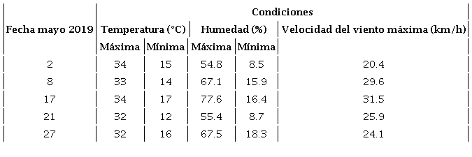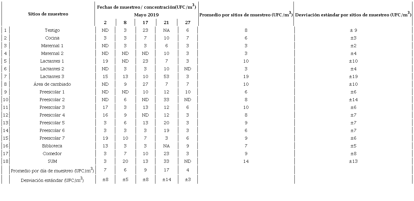 Se realizaron cinco muestreos estáticos entre el 2 y el 27 de mayo en 18 sitios del interior del CDI, identificados como: testigo, cocina, maternal 1 y 2, lactantes 1, 2 y 3, área de cambiado, preescolar 1, 2, 3, 4, 5, 6 y 7, biblioteca, comedor y sala de usos múltiples (SUM). Durante el periodo de muestreo no llovió y los datos climáticos se reportan en la Tabla I. Las condiciones meteorológicas se tomaron de los reportes que realiza la estación del Aeropuerto Internacional “Ignacio Pesqueira García” de la ciudad de Hermosillo, Sonora, ubicado aproximadamente a 10 km del CDI.