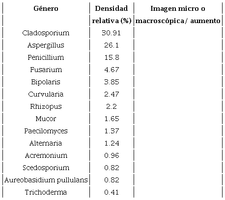Los géneros fúngicos identificados en un 73% corresponden a Cladosporium spp., Aspergillus spp. y Penicillium spp. Numerosos estudios coinciden en que estos tres géneros son los más comunes y su concentración en el aire varía, dependiendo de factores biológicos y climáticos (Rojas, Llanes, Benitez, Aira & Malagón, 2007; Araujo, Cabral & Rodrigues, 2008; Allende et al., 2013; Sánchez & Almaguer, 2014). Cladosporium, esporula en circunstancias atmosféricas de tiempo seco y sus esporas se esparcen en la atmósfera en días ventosos, de baja humedad relativa y de altas temperaturas, siendo una especie relacionada con el asma (Fraj, 2015). Del género Aspergillus, 20 especies se reconocen como patógenas humanas, por el pequeño tamaño de sus conidios que pueden permanecer en suspensión en el ambiente durante períodos largos. Esto aumenta la probabilidad de su inhalación y su consecuente penetración al tracto respiratorio (Rojas et al., 2007; Fairs et al., 2013).