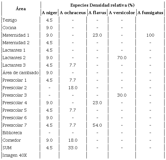 En casi todas las áreas se detectaron las cepas de los géneros Cladosporium, Penicillium y Aspergillus, este último con el mayor número de especies identificadas y de interés clínico, ya que pueden causar infección en el pulmón, en los senos paranasales y en muchos casos se asocian con broncopulmonías alérgicas, aspergilosis, queratitis y sinusitis alérgica (Borrego & Perdomo, 2012), además de comportarse como patógenos oportunistas en pacientes inmunocomprometidos (García & Sánchez, 2012). En la Tabla IV se presentan las especies que se aislaron, Aspergillus niger fue el predominante, aunque se detectaron también A. flavus y A. versicolor, datos coincidentes con lo reportado por Borrego & Perdomo (2012).