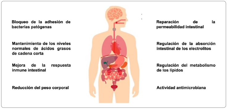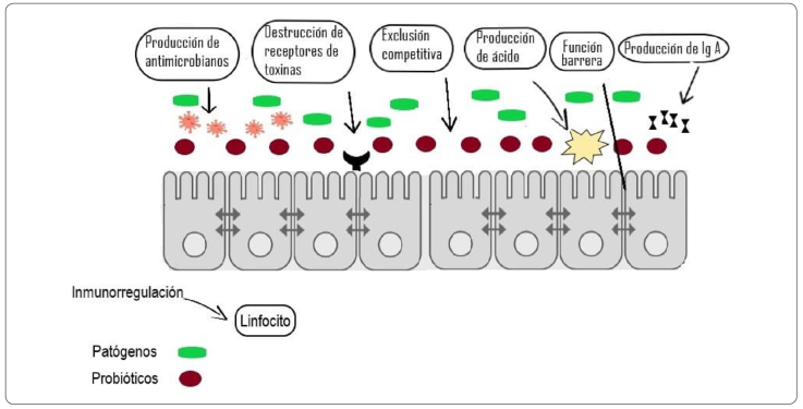 La palabra “probiótico” se deriva del griego y significa “pro vida”. La Organización Mundial de la Salud (OMS) y la Organización de las Naciones Unidas para la Agricultura y Alimentación (FAO) definen a los probióticos como “organismos vivos que al ser administrados en raciones adecuadas confieren un beneficio a la salud del hospedero” (Márquez-Villalobos, López-Lemus, Reyes-Escogido & Ramírez-Emiliano, 2017). También, los probióticos pueden definirse como suplementos dietéticos que contienen cepas microbianas vivas capaces de persistir (o colonizar transitoriamente) en el tracto intestinal humano, mejorando la salud al conferir una influencia benéfica sobre la fisiología del hospedero. Este proceso, es particularmente importante cuando se ha alterado la microbiota nativa normal: es en ese momento, cuando un suplemento exógeno de probióticos de una especie/cepa al colonizar temporalmente el tracto intestinal estabiliza la composición de la microbiota original, restaurando la función fisiológica vital, convirtiéndose en una microbiota comensal (Sharifi-Rad et al., 2020; Sing, Sharma, Babu & Singla, 2013) . Se ha determinado que los efectos benéficos de los probióticos se producen a través de diversos mecanismos de acción (Figura 1) que incluyen: (a) Bloqueo de la adhesión de bacterias patógenas, (bacterias que poseen la capacidad de producir un daño, a cualquier nivel, en un organismo hospedero susceptible), al epitelio intestinal mediante el descenso: del pH intestinal, de la producción de metabolitos y de agentes inhibidores entre los que destacan los ácidos grasos libres, los péptidos antibacterianos, el ácido láctico y agentes oxidantes como el peróxido de hidrógeno; (b) Supresión del crecimiento de las bacterias patógenas mediante la unión directa a las bacterias gramnegativas inhibiendo la invasión bacteriana y bloqueando la adhesión y translocación de los patógenos al epitelio; (c) Mantenimiento de los niveles normales de ácidos grasos de cadena corta (AGCC): Los productos de la actividad metabólica de los probióticos como el etanol, lactato, acetato, ácido fólico, piruvato y succinato, pueden ser metabolizados para producir AGCC, que influyen en el metabolismo, proliferación y apoptosis de las células epiteliales. Se ha demostrado, en experimentos in vitro que estas moléculas inhiben la proliferación celular e incrementan la apoptosis de células malignas (Suez, Zmora, Segal & Elinav, 2019; Reyes-Esparza & Rodríguez-Fragoso, 2012; Medina-Torres, Espinosa-Padilla, Camacho-Castillo & Carvajal-Aguilera, 2014); (d) Mejoría en la respuesta inmune intestinal y supresión de la liberación de citocinas proinflamatorias que facilitan el desarrollo y el mantenimiento de una respuesta inflamatoria crónica del intestino. Los mecanismos de interacción de los probióticos con las células del sistema inmune son diversos. En el caso de las bacterias ácido lácticas, se ha observado que son captadas por las células M presentes en el epitelio y facilitan la estimulación del tejido linfoide asociado a la mucosa intestinal. Las células dendríticas capturan bacterias probióticas con sus prolongaciones citoplasmáticas que acceden al espacio luminal. Muchos de los efectos inducidos por los probióticos dependen de la interacción del microorganismo con la célula dendrítica (CD), por la capacidad que tiene de polarizar la respuesta inmune adaptativa (Manzano, Estupiñan & Poveda, 2012). Las funciones del epitelio intestinal son reguladas por los probióticos mediante las vías de señalización intracelular específicas, como las proteínas quinasas activadas por mitógenos (MAPK) y el factor nuclear kappa b (NF-κB) en las células epiteliales intestinales (Yan & Polk, 2020). Las cepas probióticas tienen una influencia significativa sobre la barrera intestinal al estimular las células B para la producción de inmunoglobulina A (IgA) que es la primera línea de defensa frente a la infección, mediante la inhibición de la adhesión bacteriana y viral a las células epiteliales, así como la neutralización de las toxinas bacterianas y víricas. En estudios in vitro con células de enterocitos (HT-29, caco -2 y CD), se ha reportado que los probióticos también influyen en la producción de citocinas a través de células presentadoras de antígeno (APC), que inicia una respuesta adaptativa. La relación de la activación de esta APC con la producción de las citocinas depende del tipo de cepa del probiótico, observándose casos de inhibición o estimulación de la producción de las citocinas interleucina- 10 (IL-10) e interleucina-12 (IL-12) lo que favorece un estado de tolerancia o una respuesta inmune Th1 respectivamente, al considerar que el proceso inflamatorio depende de las citocinas proinflamatorias y las antiinflamatorias, donde la citocina antiinflamatoria IL-10, es producida por monocitos, células T, células asesinas naturales (NK) y CD, que inhiben a las citocinas proinflamatorias, quimiocinas y receptores de quimiocinas, responsables de la inflamación intestinal (Azad, Sarker & Wan, 2018; Manzano, Estupiñan & Poveda, 2012); (e) Reparación de la permeabilidad intestinal: Los probióticos poseen la capacidad de adherirse a los enterocitos y a los colonocitos afectando a la composición del ecosistema intestinal e incrementando el efecto barrera no dependiente del sistema inmunológico Las uniones estrechas entre las células de la mucosa son fundamentales para evitar la entrada de patógenos a la circulación. La modificación en la expresión y la redistribución de las uniones estrechas reduce la permeabilidad intestinal limitando la absorción de moléculas nocivas (Tormo-Carnicé, 2006; Reyes-Esparza & Rodríguez-Fragoso, 2012); (f) Regulación de la absorción intestinal de electrolitos: La regulación es posible por el aumento de la superficie intestinal de absorción, a las dimensiones de las microvellos