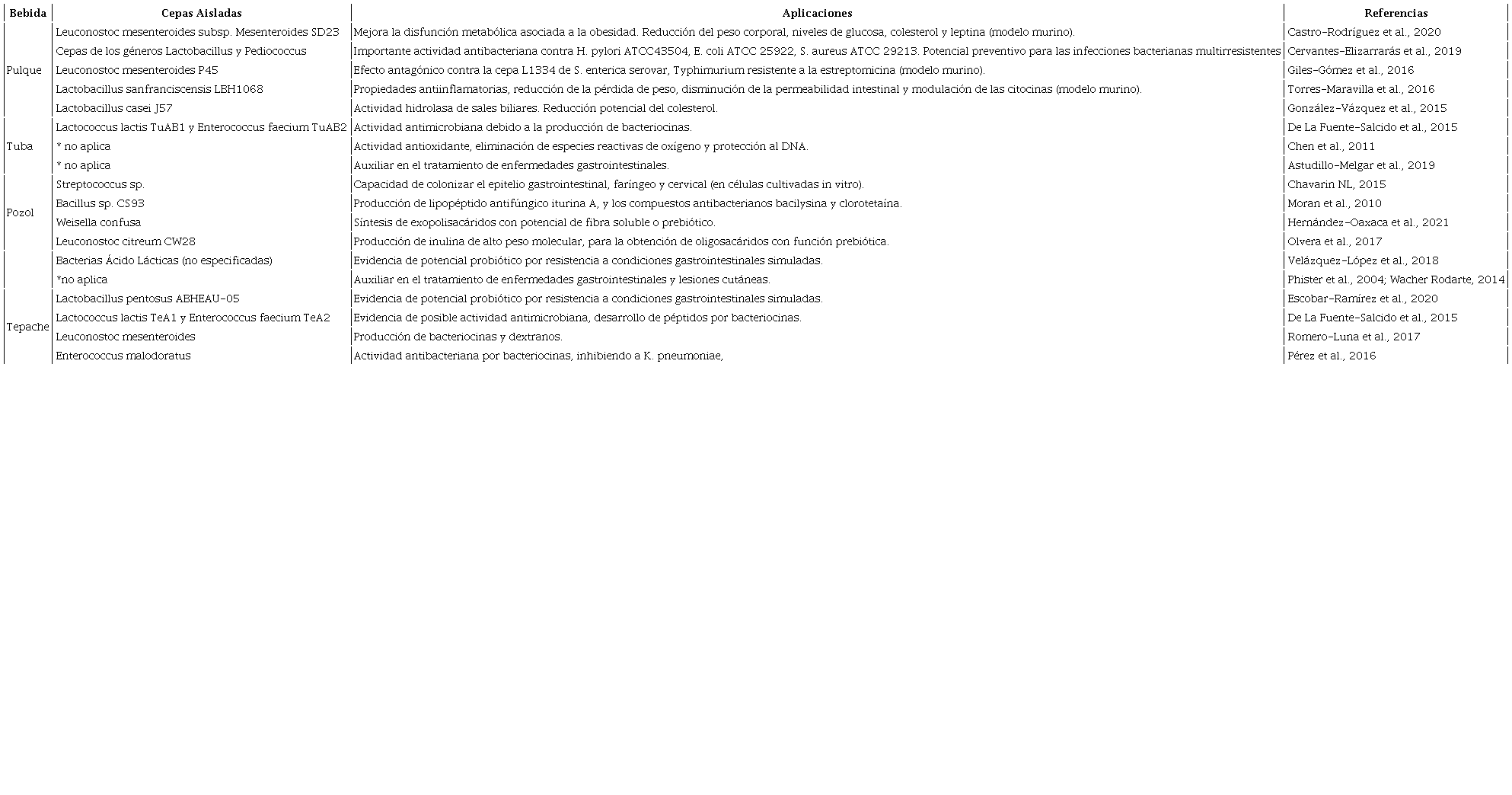 En México, se producen diversas bebidas fermentadas a partir de una amplia gama de: cereales (maíz, cebada y trigo), frutos (manzana, piña, tamarindo, tuna y cacao) y plantas (palma de coco (Coccos nucifera), palma de coyol (Acrocomia aculeata) y diversas especies de agaves (Agave angustifolia Haw, Agave cupreata Trel. & Berger, Agave filifera Salm-Dyck, Agave hookeri Jacobi, Agave inaquidens K. Koch, Agave salmiana Otto ex Salm-Dyck, Agave schidigera Lem, Agave tequilana Weber, Agave karwinskii y Agave potatorum) (Vilela, Cosme & Inês, 2020; Pérez-Hernández, Chavez-Parga & González-Hernández, 2016), debido a diversos factores como: ubicación, relieves extremos y ecosistemas contrastantes (Ramírez-Guzmán et al., 2019). A continuación, se describen las bebidas fermentadas no destiladas, producidas y consumidas en el país, que han sido objeto de estudio para demostrar su capacidad como probióticos (Tabla I) y aplicaciones biomédicas (Figura 2):