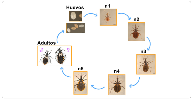 La subfamilia Triatominae (orden Hemiptera, familia Reduviidae), a la que pertenecen los insectos triatominos, está compuesta por 149 especies, distribuidas principalmente en el continente americano. Tras eclosionar del huevo, los triatominos pasan por cinco estadios ninfales hasta llegar al imago o adulto (Figura 3) (Dujardin, Schofield & Panzera, 2002; Jurberg & Galvão, 2006). Los triatominos son hematófagos; la mayoría se alimentan de sangre de mamíferos o aves, aunque existen reportes sobre especies que pueden consumir sangre de reptiles o anfibios (Schofield, 1979; Jurberg & Galvão, 2006). Algunas especies de triatominos pueden alimentarse de savia de las plantas, azúcar de forma experimental, sangre consumida por otros insectos (cleptohematofagia), heces de otros triatominos (coprofagia) o hemolinfa de otros triatominos (hemolinfagia) (Jurberg & Galvão, 2006; Díaz-Albiter et al., 2016; De Fuentes-Vicente & Gutiérrez-Cabrera, 2020). Machos y hembras se alimentan de sangre durante los cinco estadios de ninfa y como adultos, aunque la cantidad de sangre que ingieren varía según la especie y la etapa de vida en la que se encuentran (Jurberg & Galvão, 2006; De Fuentes-Vicente & Gutiérrez-Cabrera, 2020).