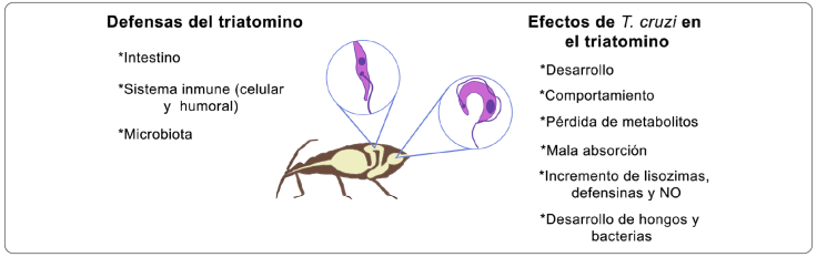 La presencia de T. cruzi tiene efectos en el insecto transmisor durante su paso por los segmentos del tracto digestivo de éste, donde enfrenta la acción de diferentes enzimas. Aunque tradicionalmente se afirma que el parásito no tiene efecto alguno sobre el vector, estudios recientes demuestran que es capaz de modificar el comportamiento del insecto al activar su sistema inmune y alterar la microbiota asociada (Kollien & Schaub, 2000; Schaub, Meiser & Balczun, 2011; Jiménez-Cortés et al., 2020).