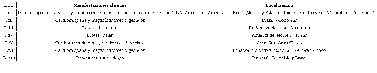 T. cruzi TcVI, extendida por el norte de Ecuador y Colombia, el Cono Sur y el Gran Chaco, se transmite por el vector T. infestans. Los pacientes infectados con esta DTU presentan cardiomiopatía y megasíndromes digestivos (Messenger et al., 2015).