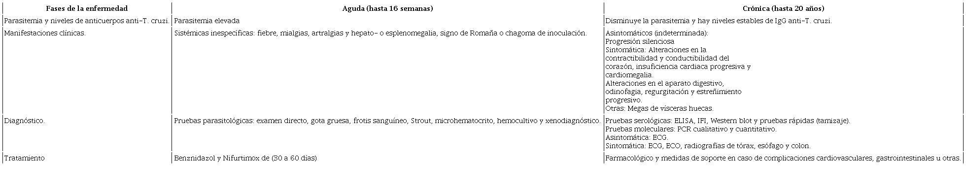 La fase aguda dura de 4 a 16 semanas, y la parasitemia disminuye después de 90 días. Los síntomas de esta fase se resuelven de forma espontánea, y los pacientes pasarán a la fase crónica si no se les brinda tratamiento (Pérez-Molina & Molina, 2018). La fase crónica presenta dos formas: la indeterminada o asintomática y la determinada o sintomática (Carabarin-Lima et al., 2013). En la forma indeterminada no se presentan signos ni síntomas de la enfermedad (Rassi et al., 2010) y en la forma determinada los pacientes presentan afectaciones cardiacas o gastrointestinales (Alonso-Padilla et al., 2019). La miocardiopatía chagásica crónica (CCC) es la manifestación clínica más frecuente y grave (Carabarin-Lima et al., 2013).