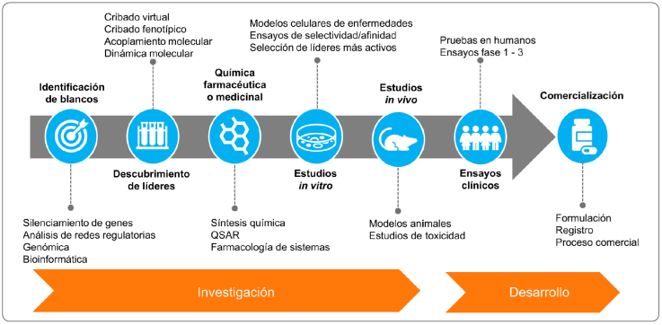 El desarrollo de fármacos es un proceso complejo que consta de varias etapas y donde participan diversas áreas del conocimiento. Actualmente, un estudio de este tipo puede tomar entre 10 y 15 años, tener un costo promedio de $1,350 millones de dólares (DiMasi, Grabowski & Hansen, 2016) y, aun así, tener una probabilidad de fallar del 90% al 96% (Hingorani et al., 2019); sin embargo, las investigaciones continúan para mejorar los métodos que generen resultados positivos. El desarrollo de fármacos se divide en dos grandes fases: la primera es la investigación que comprende la identificación, caracterización y validación del blanco o blancos moleculares. No obstante, en los últimos 15 años el interés por desarrollar fármacos no se ha limitado a compuestos altamente selectivos (un solo blanco), en contraste, un enfoque de búsqueda de compuestos dirigidos a múltiples dianas terapéuticas ha adquirido fuerza (Ramsay, Popovic-Nikolic, Nikolic, Uliassi & Bolognesi, 2018). El siguiente paso es la identificación y la optimización de las moléculas con actividad biológica que hasta hace 10 años era realizado principalmente por el ensayo masivo de moléculas sobre modelos celulares o animales (cribado fenotípico); sin embargo, este proceso se agilizó con los avances en los métodos computacionales, principalmente en el campo de la inteligencia artificial (IA). Lo anterior se traduce en un ahorro de recursos y tiempo, además de producir mejores resultados como fármacos con menores efectos secundarios (Paul et al., 2021); La segunda etapa se centra en los ensayos clínicos, la formulación, el proceso comercial y el registro del medicamento novedoso (Parvathaneni, Kulkarni, Muth & Gupta, 2019) (Figura 1).