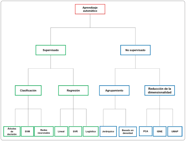 El AA se centra en el desarrollo de sistemas que aprenden mediante la identificación de patrones y en función de los datos disponibles con el objetivo de hacer predicciones. El aprendizaje se realiza mediante la construcción de modelos, que son un conjunto de operaciones y parámetros de entrada y salida de datos, y para entrenarlos se utilizan diversos algoritmos. Un flujo de trabajo clásico del AA consiste en cuatro pasos: (1) El preprocesamiento de datos; en donde se limpia, transforma y reducen los datos con el objetivo de filtrar o eliminar los de baja calidad, reducir el ruido, remover valores anormales o duplicados para mejorar la calidad de los resultados; entre las técnicas comúnmente utilizadas se encuentra la normalización, fusión y reducción de datos, estandarización e imputación de valores perdidos (Malley, Ramazzotti & Wu, 2016). (2) La extracción de características; se selecciona un subconjunto de las características totales de los datos originales mediante la reducción de la dimensionalidad usando técnicas como análisis de componentes principales (PCA) (Jolliffe & Cadima, 2016), incrustación de vecinos estocásticos distribuidos en t (t-SNE) (Linderman & Steinerberger, 2019) y escalamiento multidimensional (MDS) (Mugavin, 2008), etc., con el objetivo de eliminar características altamente correlacionadas, redundantes o irrelevantes, reduciendo el tamaño y la complejidad del modelo para hacer el entrenamiento más fácil y rápido (Saeys, Inza & Larrañaga, 2007). (3) El entrenamiento del modelo; en el que se utilizan dos tipos principales de algoritmos llamados aprendizaje supervisado y no supervisado. En el aprendizaje supervisado, que es el más utilizado, los modelos se entrenan mediante datos previamente etiquetados y su resultado está predefinido. Algunos ejemplos de aprendizaje automático supervisado incluyen algoritmos de regresión, empleados para modelar la relación entre una variable dependiente y una o más variables predictivas. Entre los algoritmos de regresión, están: a) el lineal que determina la tendencia de un conjunto de datos continuos, b) el de logística que se utiliza para datos discretos y c) la logarítmica que es una generalización de la regresión lineal para datos multivariados (Doan & Kalita, 2015). Las máquinas de soporte vectorial o Support Vector Machines (SVM) son un conjunto de algoritmos de aprendizaje supervisado, un método de clasificación y regresión binaria basado en espacios p-dimensionales llamados hiperplanos que son subespacios de una sola dimensión que no pasan por el origen, y se aplican en problemas de clasificación múltiple (Hearst, Dumais, Osuna, Platt & Scholkopf, 1998). Los árboles de decisión son algoritmos predictivos del valor de una variable en función de otras variables de entrada; las predicciones son realizadas mediante métodos probabilísticos como el de bosques aleatorios o Random Forest (RF) que son un conjunto de árboles de decisión en donde cada árbol ve una porción de los datos de entrenamiento, y al final, al combinar los datos de cada árbol aumenta el poder de generalización mientras disminuye el error. Los algoritmos de aprendizaje no supervisado son capaces de identificar procesos y patrones complejos, sin la necesidad de entrenarlos con datos etiquetados o resultados predefinidos. Entre estos algoritmos encontramos k-medias, tSNE, PCA y Linear Discriminant Analysis (LDA). La mayoría de estos algoritmos funcionan a través de la reducción de la dimensionalidad que implica transformaciones lineales (Dash, Nayak & Mishra, 2021). En la Figura 2 se resumen los principales algoritmos del AA. (4) La evaluación del modelo; es necesario evaluar los modelos de aprendizaje para determinar su desempeño y realizar predicciones acertadas con futuros datos. Al llevar a cabo esta validación se separan del modelo los datos de los que ya se conoce una respuesta, y se etiquetan con valores reales como comprobación de la capacidad de generalización. Entre las métricas empleadas para evaluarlos encontramos: exactitud, precisión y exhaustividad que cuantifican la tasa de falsos positivos y negativos, puntuación F1 (media armónica de precisión y exhaustividad), curva de características operativas del receptor (ROC), índice Jaccard y coeficiente de Ginni (Handelman et al., 2019).
