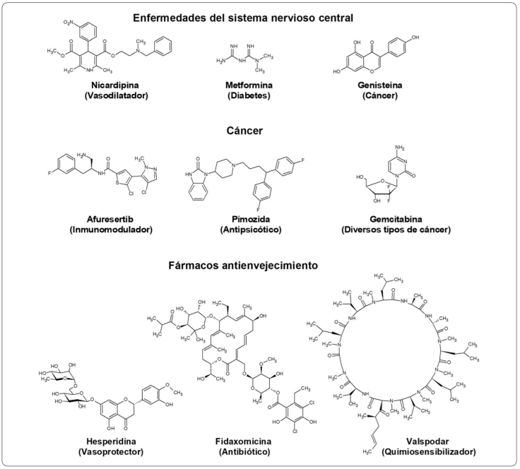 El envejecimiento es un fenómeno biológico complejo, progresivo y universal con una disminución de la capacidad de respuesta de los organismos ante agentes estresores, aumentando de esta manera la acumulación de daño celular que conduce a la fragilidad y finalmente a la muerte. El envejecimiento es el principal factor de riesgo para la aparición y progresión de diversas enfermedades crónico-degenerativas como el Alzheimer, el Parkinson, la diabetes, la artritis y el cáncer, etc. (Rattan, 2006; López-Otín, Blasco, Partridge, Serrano & Kroemer, 2013). En los últimos años, los métodos computacionales para buscar fármacos capaces de retrasar el deterioro asociado al envejecimiento y las enfermedades crónico-degenerativas han ganado popularidad (Mallikarjun & Swift, 2016; Dönertaş, Fuentealba, Partridge & Thornton, 2019), algunos fármacos candidatos a reposicionamiento para evitar y ralentizar el envejecimiento se muestran en la Figura 3. Tomando en cuenta las características de la ontología de genes (GO), Barardo et al., (2017) construyeron un modelo usando RF para identificar fármacos y extender la vida del gusano Caenorhabditis elegans; que previamente han mostrado aumentar la esperanza de vida de especies como Drosophila melanogaster, Mus musculus, Rattus norvegicus y Mytilina brevispina, etc. El modelo determinó que existe un rango del 63% al 68% de probabilidad de que los siguientes fármacos extiendan la vida del gusano: Valspodar (quimiosensibilizador), Ganirelix (control de la ovulación) y Bortezomib (mieloma múltiple). Otra interesante aplicación del algoritmo RF para hallar fármacos capaces de extender la vida fue publicada por Kapsiani & Howlin (2021) que con una exactitud superior al 80% lograron identificar los vasculoprotectores Diosmina y Hesperidina, además de los antibióticos Fidaxomicina, Rifapentina y Clortetraciclina como potenciales candidatos a ser reposicionados, ya que extendieron la vida de Caenorhabditis elegans hasta un 60%.