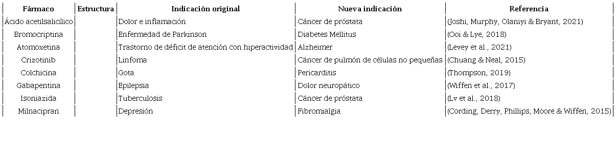 Con el objetivo de reducir el tiempo de investigación y desarrollo (I+D), surgió una estrategia conocida como reposicionamiento de fármacos (REFA), que consiste en encontrarles distintas aplicaciones terapéuticas, diferentes a las descritas originalmente. El mejor ejemplo del REFA es el Sildenafil (Viagra), que originalmente fue desarrollado para tratar la angina de pecho, pero posteriormente resultó ser efectivo para tratar la disfunción eréctil (Pushpakom et al., 2019). En la Tabla I se muestran algunos ejemplos de fármacos exitosamente reposicionados.