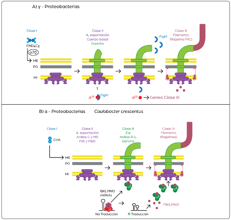 CtrA en su estado activo promueve la transcripción mediada por el factor σ70 de los genes de la Clase II. Estos genes codifican para las proteínas de los anillos de membrana, del aparato de exportación y de algunos elementos regulatorios como FlbD, FliX, RpoN (σ54), FlaF y FlbT (Muir & Gober, 2004; Davis & Viollier, 2011). La proteína FliX se une a FlbD y bloquea su activación hasta que se termina de ensamblar el aparato de exportación y el anillo MS. El ensamblaje de estas estructuras es requerido para la activación de FlbD, que junto con el factor σ54 promueve la transcripción de los genes de la Clase III y IV (Ramakrishnan & Newton, 1990; Muir & Gober, 2004; Xu et al., 2011).