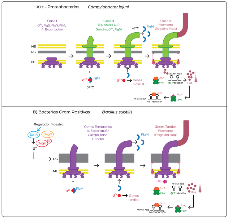 A nivel postranscripcional, las flagelinas están reguladas por las proteínas FlaF y FlbT (Anderson & Gober, 2000; Llewellyn et al., 2005). Antes de que el gancho se termine de ensamblar, la flagelina FljJ interacciona con FlbT, por lo que el complejo inhibe la traducción de las demás flagelinas mediante su unión a los motivos GCAAAA y GNCAA(A/U)A localizados en la región 5´UTR del mensajero de las flagelinas. Una vez que el gancho se termina de ensamblar, FljJ se disocia de FlbT para ser secretada y formar el filamento con la ayuda de FlaF que funciona como una chaperona. En el momento de la disociación del complejo FlbT-FljJ, FlbT se inactiva y, por lo tanto, la traducción de las demás flagelinas se activa y son secretadas con ayuda de FlaF para ensamblar el filamento (Figura 1B, Tabla I) (Mangan et al., 1999; Llewellyn et al., 2005; Ardissone, Kint, Petrignani, Panis & Viollier, 2020).