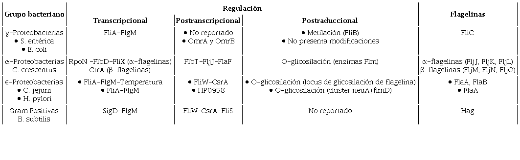 El objetivo de esta revisión es recapitular los mecanismos de regulación que controlan la expresión de la flagelina, los cuales se presentan de forma similar en los diferentes grupos bacterianos. La respuesta de los mecanismos regulatorios está condicionada a los cambios ambientales y para evadir la respuesta inmune de algunos organismos (Klose & Mekalanos, 1998; Soutorina & Bertin, 2003).