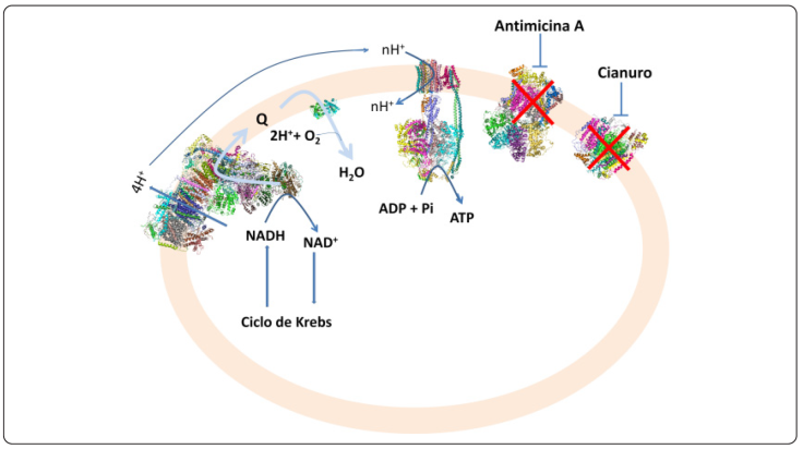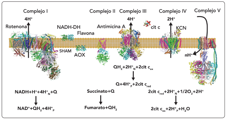 La cadena respiratoria clásica o cadena de transporte de electrones (CTE) consiste de cuatro grandes complejos proteicos, a saber: la NADH:ubiquinona oxidorreductasa o NADH deshidrogenasa (complejo I, CI), que transfiere los electrones del NADH a la ubiquinona (Q) y transloca 4 protones a través de la membrana interna mitocondrial (Figura 1). Los electrones del succinato, intermediario del ciclo de Krebs, llegan a la ubiquinona vía la succinato:ubiquinona oxidorreductasa (complejo II, CII) o succinato deshidrogenasa. Esta enzima no bombea protones a través de la membrana. Desde la poza de ubiquinona los electrones del ubiquinol (QH2) se transfieren, a través de la ubiquinol:citocromo c oxidorreductasa (complejo III, CIII) y la citocromo c oxidasa (complejo IV, CIV), al oxígeno, generando agua. La transferencia de los electrones del ubiquinol al oxígeno se acopla con el transporte neto de 6 protones, 4 por el CIII y 2 por el CIV (Figura 1). El gradiente de protones resultante lo utiliza la F0F1-ATP sintasa (complejo V) para generar ATP (Grahl, Dinamarco, Willger, Goldman & Cramer, 2012). Adicionalmente, se encuentran dos acarreadores de electrones, la ubiquinona y el citocromo c. Hay organismos que tienen una o más NADH deshidrogenasas alternas (NDH2) y oxidasas alternas (AOX), que no transportan protones a través de la membrana interna mitocondrial. Las NDH2 son proteínas monotópicas de membrana, homodiméricas, insensibles a la rotenona, pero sensibles a la flavona. Cuando el complejo I se inhibe con rotenona o con compuestos como la piericidina A, las NDH2 sustituyen la función del CI debido a que transfieren los electrones del NADH a la ubiquinona (Ecuación 1) y, de esta manera, permiten que la parte terminal de la cadena respiratoria (CIII y CIV) y el ciclo de Krebs sigan trabajando.