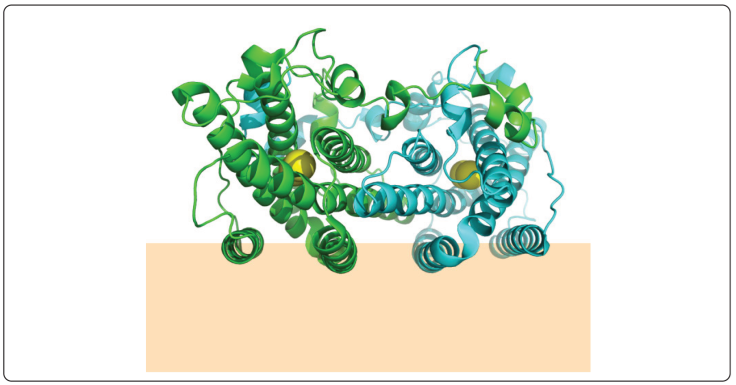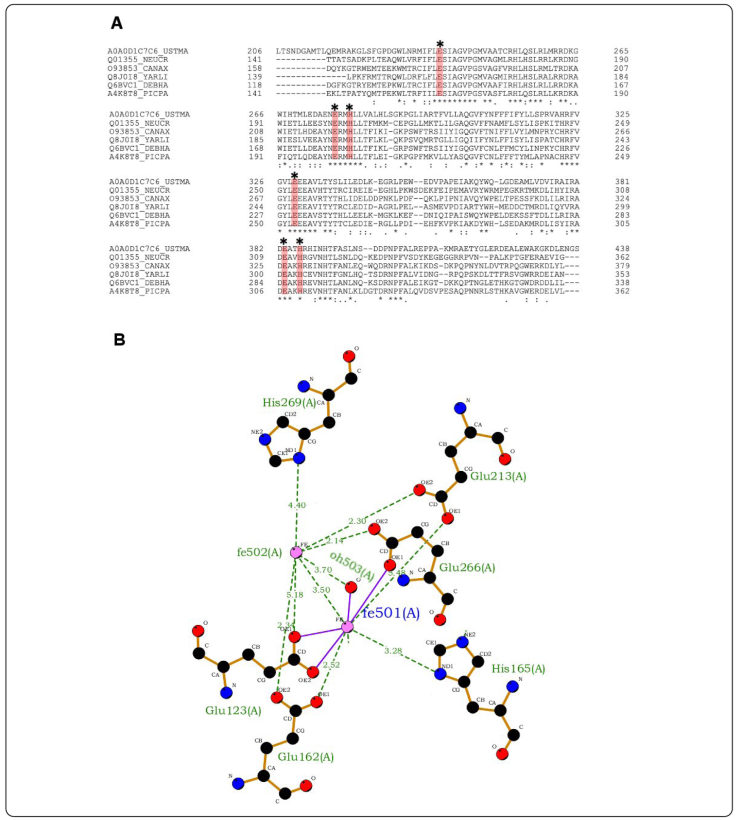 La AOX es una metaloproteína monotópica anclada a la superficie interna de la membrana mitocondrial (Figura 2). La interacción del homodímero con la superficie interna de la bicapa lipídica se lleva a cabo a través de cuatro hélices alfa, sin que existan cruces transmembranales. La mayor parte de la proteína sobresale hacia la matriz mitocondrial (Figura 2 y Figura 3B) (Siedow, 2013). El monómero tiene una masa molecular de 32-40 kDa, dependiendo de la especie. El sitio activo consiste de un centro de diférrico, no hemo, coordinado por dos residuos de histidina y cuatro de glutamato (Figuras 3A y 3B). Estos seis residuos están conservados en todas las oxidasas alternas. En la Figura 3A se muestra el alineamiento de las secuencias de aminoácidos de las AOX de un número reducido de hongos que son importantes como modelos de estudio: Neurospora crassa, Candida albicans, Yarrowia lipolytica, Debaryomyces hansenii y Picchia pastori. Con un asterisco se indican los residuos conservados que participan en la coordinación de los iones Fe3+ (Figura 3A). En la Figura 3B se muestra la interacción de los cuatro residuos de glutamato y los dos de histidina con los iones Fe3+ y las distancias de interacción entre los diferentes átomos. La numeración se refiere a la AOX de Trypanosoma brucei, que es la única AOX que se ha cristalizado (Shiba et al., 2013). De todos los residuos involucrados en la interacción con los iones Fe3+, la His269 es la que se encuentra a mayor distancia del hierro (Figura 3B). Al igual que la acción conjunta de los complejos III y IV, la AOX reduce el oxígeno a agua con los electrones del QH2, pero sin bombeo de protones, como se muestra en la Ecuación 2 (Albury, Elliott & Moore, 2009; Moore et al., 2013).