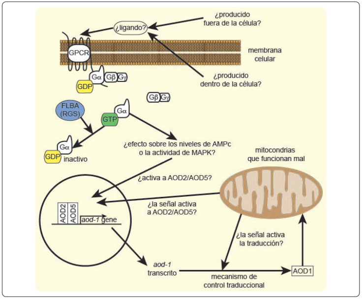 La expresión de la AOX en N. crassa está a cargo de al menos tres genes identificados: el aod-1, que corresponde al gen estructural de la AOX, y dos genes que codifican para factores de transcripción de la familia de dedos de zinc (Zn(II)2Cys6), que son el aod-2, y el aod-5 (Chae et al., 2007; Descheneau, Cleary & Nargang, 2005; Li et al., 1996; Nargang et al., 2012). Además de estos tres genes, hay otros que participan en esta regulación, como el aod-4, aod-6 y aod-7, aunque su función e identidad no han sido esclarecidas. Las proteínas AOD-2 y AOD-5 actúan en conjunto al unirse al promotor del gen de la AOX (Figura 5) (Chae et al., 2007). Sin embargo, estos dos factores de transcripción no son específicos de la AOX, ya que también están involucrados en la expresión de genes relacionados con la producción de energía y el metabolismo intermediario, por ejemplo, el del citocromo c, la fosfoenolpiruvato carboxicinasa y la malato sintasa, entre otros (Qi et al., 2016). Otro dato importante en la construcción del modelo del mecanismo molecular de la regulación de la expresión genética de la AOX es la sobreexpresión del RNAm de la AOX en la mutante que tiene defectos en el gen flbA (Bosnjak et al., 2019). Este gen codifica para una proteína que estimula la actividad de GTPasa de la subunidad Gα y, por tanto, promueve la hidrólisis del GTP en su sitio activo y su respectiva inactivación (Figura 5) (Nargang et al., 2012; Qi et al., 2016).