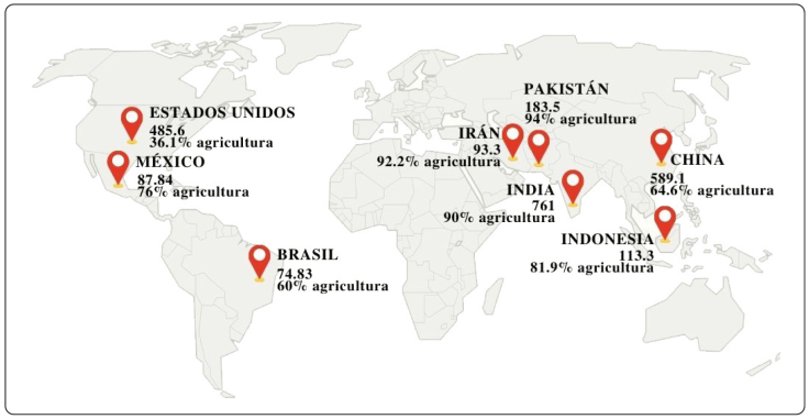 A pesar de la escasez del agua dulce, a nivel mundial cerca del 40% de los cultivos de consumo son irrigados con esta (Islam et al., 2017). La actividad agrícola representa casi un 70% de la extracción total de este recurso y al aumentar la población, también aumenta el grado de presión sobre el mismo. En la Figura 1 se muestran los países con mayor extracción de agua anualmente. México ocupa el séptimo lugar a nivel mundial.