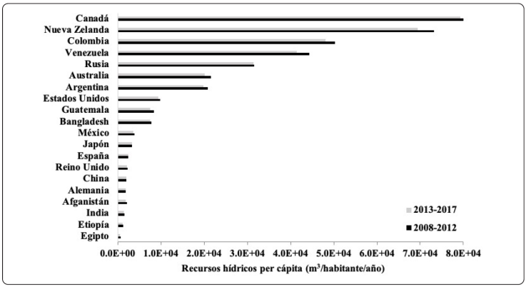 Por consiguiente, la disponibilidad del agua por habitante es diferente entre los países y va en decremento. De acuerdo al Sistema de Información Aquastat (2018), de la Organización de las Naciones Unidas para la Alimentación y la Agricultura (FAO, por sus siglas en inglés: Food and Agriculture Organization of the United Nations), entre los años 2012 y 2017, la disponibilidad per cápita se ha reducido a nivel mundial (Figura 2), principalmente en países como Canadá (3, 911 m3/hab/año), Colombia (2, 242 m3/hab/año) y Nueva Zelanda (3, 701 m3/hab/año) y en menor proporción, Estados Unidos (336 m3/hab/año), Afganistán (289 m3 /hab/año) y México (247 m3/hab/año) . En el caso particular de México, la CONAGUA estima que para el año 2030 el agua renovable per cápita a nivel nacional se reducirá, siendo las regiones hidrológico-administrativas del Valle de México, el Río Bravo y la península de Baja California las más afectadas con 134 m3/hab/año, 894 m3/hab/año y 881 m3/hab/año, respectivamente (CONAGUA, 2018).