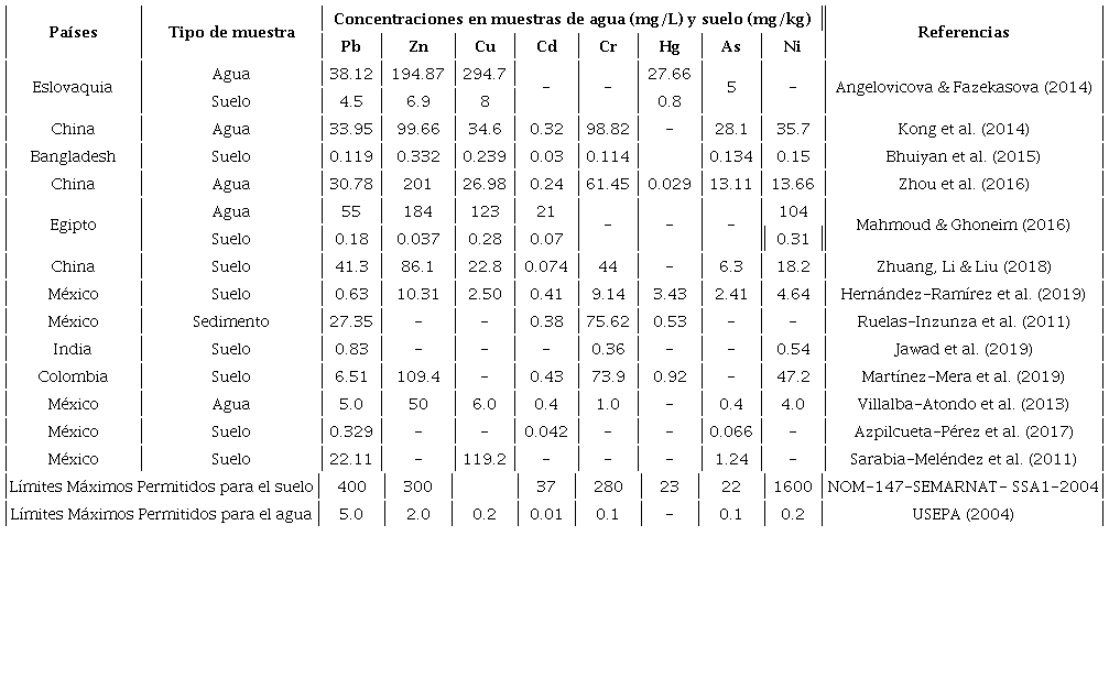 En los últimos años, se han realizado diversos estudios relacionados con la contaminación de los recursos naturales a escala nacional (Hernández-Ramírez et al., 2019) e internacional (Ahmed, Matsumoto, Ozaki, Thinh & Kurosawa, 2019; Gyamfi, Appiah-Adjei & Amaning-Adjei, 2019). Específicamente, el estudio del agua y el suelo resulta de gran interés debido a la dispersión, bioacumulación y transporte de los contaminantes que se albergan en ellos (Manoj, Thirumurugan & Elango, 2017).
