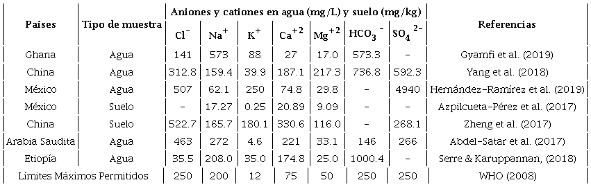 Algunos estudios, como el de Zheng et al. (2017) reportan que al evaluar la calidad del agua del Río Basin, en China, el 15.56% de 45 muestras, es apta para fuentes centralizadas de agua potable, actividades recreativas y uso doméstico, el 46.67% es útil para el consumo humano, la agricultura y la industria, mientras que el 37.78% puede ser utilizada para actividades agro-industriales pero no para su consumo por las altas concentraciones de elementos como el NH4+-N, el Cl- y el NO2-N. En México, Valles-Aragón et al. (2017) mencionan que tras el análisis del agua de 13 pozos de una zona nogalera en Chihuahua, se localizó un pozo con agua altamente salina, siendo perjudicial para el desarrollo de los cultivos como el nogal pecanero. Otro ejemplo son los estudios realizados por Hernández-Ramírez et al. (2019), en México, el Río Atoyac contiene altas concentraciones de SO42-, Ca2+, Mg2+, F- y PO4-, atribuidas principalmente a las actividades antropogénicas, rocas en la litosfera y residuos de fertilizantes. La Tabla II muestra estudios realizados en diversas zonas geográficas que reportan cifras elevadas de aniones y cationes en muestras de agua y suelo.