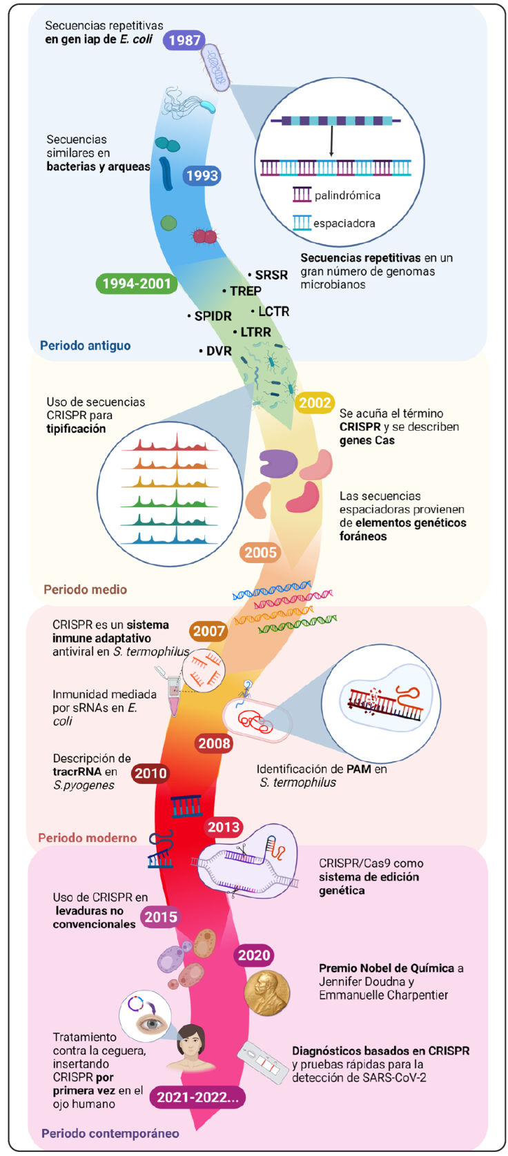 Los sistemas CRISPR (Clustered Regularly Interspaced Short Palindromic Repeats) y sus proteínas Cas (CRISPR Associated Proteins) son un grupo de genes que actúan de manera simultánea para identificar y eliminar las secuencias de DNA invasoras, funcionando como una memoria de infecciones previas en la mayoría de los procariontes (bacterias, ~50%; arqueas, ~87%) (Makarova et al., 2015; Zhang, Wu, Wu, Chang & Liu, 2021). Estas secuencias fueron descritas por primera vez en 1987 por Ishino y colaboradores como una serie de repeticiones interespaciadas de DNA parcialmente palindrómicas (del griego palin dromein, refiriéndose a una frase que se lee igual hacia adelante que hacia atrás), en la región 3’ río abajo del gen responsable de la conversión de la isoenzima fosfatasa alcalina (iap) de Escherichia coli (Ishino, Shinagawa, Makino, Amemura & Nakatura, 1987). Posteriormente, otros grupos de investigación reportaron secuencias palindrómicas similares de ~29 nucleótidos espaciadas de manera repetida por otros ~32 nucleótidos en especies de bacterias (Mycobacterium tuberculosis) y arqueas (Haloferax mediterranei) (Groenen, Bunschoten, Van Soolingen & van Embden, 1993; Mojica, Juez & Rodríguez-Valera, 1993). Los avances en la secuenciación de genomas en los años 90 hicieron posible encontrar más secuencias de otras especies en los siguientes años. Aunque su estructura y función no estaban del todo dilucidadas, fueron utilizadas en la tipificación de bacterias (Barrangou & Horvath, 2017). En este periodo surgieron distintos acrónimos para nombrarlas como: repeticiones variables directas (DVR), repeticiones en tándem (TREP), secuencias repetitivas repetidas en tándem largas (LTRR), repeticiones cortas espaciadas de manera regular (SRSR), grupos grandes de repeticiones en tándem (LCTR) y repeticiones directas intercaladas con espaciador (SPIDR). En 2002, Jansen y colaboradores las nombraron "CRISPR" y se describieron los genes Cas (Figura 1) (Mojica, Díez-Villaseñor, García-Martínez & Soria, 2005; Barrangou & Horvath, 2017; Jansen, Van Embden, Gaastra & Schouls, 2002). En los siguientes años, se logra entender la función de las múltiples proteínas Cas descubiertas, proponiendo a CRISPR como un sistema de inmunidad adquirida ante los bacteriófagos (Makarova, Grishin, Shabalina, Wolf & Koonin, 2006; Barrangou et al., 2007). Jinek y colaboradores (2012) generan una quimera de RNA que puede unirse a Cas9, sugiriendo una posible aplicación como sistema de edición genética (Jinek et al., 2012). Posteriormente, inicia la revolución CRISPR y su uso se hizo común en bacterias, levaduras, plantas, animales y otros organismos, debido a la rapidez y versatilidad del sistema. En 2020, Jennifer Doudna y Emmanuelle Charpentier de la Universidad de California, Berkeley, recibieron el Premio Nobel de Química por crear y proponer el RNA guía, que marcó el comienzo de la edición genética en todo tipo de células (Ledford & Callaway, 2020). En los siguientes dos años, CRISPR se utilizó para detectar al virus de SARS-CoV-2 mediante pruebas rápidas y lograrlo abatir (de Puig et al., 2021; Liu et al., 2021). Las pruebas portátiles para diagnosticar COVID-19 basadas en CRISPR detectan una amplia gama de objetivos moleculares de importancia médica (Kaminski, Abudayyeh, Gootenberg, Zhang & Collins, 2021). CRISPR también tuvo éxito en intervenciones médicas al insertarlo de manera directa en la retina del ojo humano con el fin de combatir el trastorno de ceguera hereditario (Ledford, 2020). Asimismo, se han obtenido resultados alentadores con CRISPR en la primera terapia celular en humanos para intentar erradicar el cáncer pulmonar (He, 2020), incluyendo estudios exitosos in vitro e in vivo en animales modelo para tratar diferentes tipos de cáncer (Katti, Diaz, Caragine, Sanjana & Dow, 2022). En 2021, se comenzaron a realizar ensayos clínicos para usar CRISPR en el tratamiento de pacientes con la enfermedad de células falciformes (Eisenstein, 2021; Kaiser, 2021). En los últimos años, se han desarrollado más herramientas basadas en CRISPR con resultados positivos en el tratamiento de enfermedades a nivel mundial, como el cáncer de mieloma refractario avanzado, el sarcoma metastásico (Stadtmauer et al., 2020), y la fibrosis quística (Geurts et al., 2020). Además, la tecnología CRISPR/Cas tiene un papel importante en campos como la agricultura (Zaidi, Mahas, Vanderschuren & Magdy, 2020), la bioingeniería y la biotecnología (Lau, 2018). En el futuro nuevas formas inimaginables de editar genomas se sumarán a la lista creciente del sistema CRISPR/Cas.