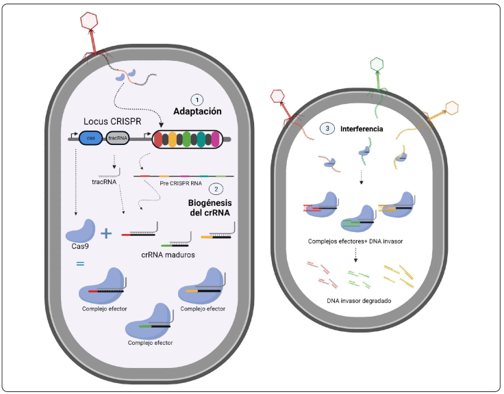 El funcionamiento general del sistema CRISPR consta de tres eventos principales: (i) la adquisición de espaciadores, conocida como la fase de adaptación, (ii) la biogénesis del CRISPR RNA (crRNA), y (iii) la interferencia (Figura 2). La adquisición comienza con la detección del DNA foráneo y su integración al cromosoma de la célula en el extremo terminal líder del locus CRISPR. La detección es mediante una secuencia de 2 a 5 nucleótidos llamada motivo adyacente del protoespaciador (PAM o Protospacer Adjacent Motif), identificada en el DNA foráneo con ayuda de las proteínas Cas. Después, la secuencia es añadida en el locus CRISPR como nuevos espaciadores que están flanqueados por secuencias repetidas (Hille et al., 2018). La siguiente etapa consiste en la transcripción del locus CRISPR y los nuevos espaciadores, generando los pre-crRNAs (precursores largos de crRNA), que se convierten en crRNAs maduros con ayuda de las RNAsas y algunas proteínas Cas. Por lo general, el crRNA se mantiene asociado a las proteínas Cas que participaron en su maduración; adicionalmente, en algunos tipos de sistemas CRISPR, el crRNA hibridiza con un RNA no codificante conocido como RNA trans-activado (tracrRNA), que es necesario tanto para el procesamiento del pre-crRNA como para la fase de interferencia (Faure et al., 2019). En la siguiente fase, las nucleasas Cas son guiadas por el crRNA (o bien, el crRNA:tracrRNA) como una “maquinaria de interferencia” hacia el DNA invasor, reconociendo las secuencias PAM, permitiendo el corte en el DNA invasor en las regiones que tienen identidad con la secuencia del crRNA (silenciamiento); o bien, se utilizará este mismo mecanismo para agregar segmentos del DNA invasor en el locus CRISPR y tener un sistema de memoria que ayudará a prevenir futuras infecciones (Hille et al., 2018).