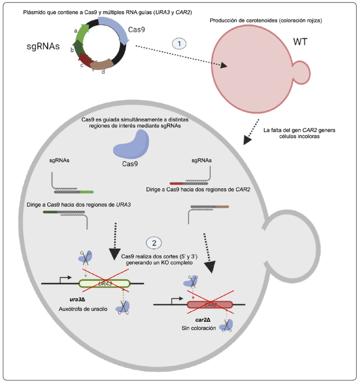 Las levaduras son hongos unicelulares con aplicaciones biotecnológicas en las áreas de medio ambiente (biorremediación y degradación de contaminantes), biocontrol (protección de cultivos, seguridad agrícola y probióticos), investigación en ciencias biomédicas (descubrimiento de fármacos, metabolismo, resistencia a fármacos y elucidación de mecanismos de las enfermedades), investigación básica en ciencias biológicas (biología celular y molecular, genómica comparada y funcional, ingeniería de rutas metabólicas y biología de sistemas), producción de proteínas (proteínas para uso farmacéutico, enzimas, hormonas, vacunas y toxinas), biocatálisis (productos farmacéuticos, productos químicos y biotransformadores), alimentos e ingredientes (enzimas, saborizantes, pigmentos, aminoácidos y ácidos orgánicos) y energías renovables (producción de biocombustibles y lipasas) (González et al., 2020; Segal-Kischinevzky et al., 2022). Durante la bioproducción con frecuencia se recurre a la ingeniería genética de levaduras que incluye la eliminación de genes, la sobreexpresión de proteínas o expresión heteróloga, lo que permite la optimización de la síntesis de metabolitos con valor agregado. Por lo tanto, el desarrollo de métodos y herramientas moleculares a partir de la edición genética de las levaduras con potencial biotecnológico es de gran interés para la academia y la industria.