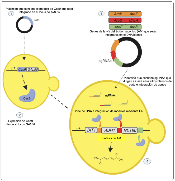 La edición del genoma por multiplex es una técnica que permite reunir múltiples genes de interés en una sola transformación dentro del genoma de una célula (Utomo et al., 2021). Malcı y colaboradores (2020) realizaron una revisión sobre los principales métodos de integración multiplex al genoma basado en CRISPR/Cas en levaduras. En su investigación destacan los métodos de Genome-Specific Multiplex Integration, Donor DNA Delivery Options, y Pre-Placed Gate Systems (Malcı, Walls & Ríos-Solís, 2020). El método de Genome-Specific Multiplex Integration primer se basa en la integración del sistema CRISPR/Cas9 conocido como método de integración delta (δ), e implica el uso de un retrotransposón de levadura (Ty), que tiene dos repeticiones directas terminales o secuencias δ. Las secuencias génicas heterólogas se insertan en la secuencia δ. La integración de CRISPR/Cas9 permite inducir múltiples rupturas de doble cadena en las secuencias δ, al admitir la integración simultánea de varias copias de grandes secuencias de DNA mediante HR (Malcı et al., 2020). El método Pre-Placed Gate Systems consiste en el uso de fragmentos sintéticos introducidos previamente y que sirven como puntos de inserción para la integración de genes. Los sgRNA deben reconocer estos sitios para facilitar la recombinación homóloga (Hou, Qin & Dai, 2018). Por último, el método Donor DNA Delivery Options se basa en la integración de plásmidos, con la ventaja de realizar cortes de doble cadena mediante CRISPR/Cas9 para mejorar la eficiencia de la integración multiplex en el genoma a través de la HR (Liu et al., 2019). El método consiste en integrar a Cas9 en el genoma mientras que los sgRNAs se expresan a partir de un vector integrador linealizado (Malcı et al., 2020). Un ejemplo de este último método fue implementado por Horwitz y colaboradores (2015), en la levadura Kluyveromyces lactis, con la finalidad de probar la eficacia del método montado previamente en S. cerevisiae. Para este experimento, integraron una vía condensada del ácido mucónico, que está constituida por seis genes (AroY, AroZ, AroD, CATA, AroF y AroB), divididos en tres construcciones de integración que son guiadas a los loci DIT1, ADH1 y NDT80 (Figura 6). Adicionalmente, la cepa K. lactis ATCC 8585 fue transformada con Cas9 en el locus GAL80. Al finalizar los experimentos de transformación, los autores consiguieron la integración sin marcadores de las tres construcciones en el genoma de K. lactis en un solo paso, con una triple integración eficaz. Este método permite realizar pruebas rápidas de combinación de mutaciones, así como la creación de prototipos de rutas metabólicas completas, que aceleran de manera drástica la ingeniería de cepas para la investigación básica y aplicada en la fermentación industrial (Horwitz et al., 2015).
