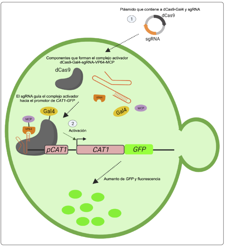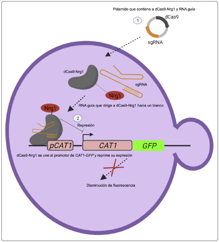 Los reguladores globales de la transcripción controlan múltiples genes en un organismo y hasta la fecha es difícil utilizarlos para regular la transcripción de un solo gen de forma específica. Actualmente, es posible modular la expresión de un gen mediante la utilización de una Cas9 inactiva y un sgRNA apropiado que en conjunto interfieren en los procesos de elongación transcripcional, la unión de las RNA polimerasas o factores de transcripción de manera específica. Esta incapacidad de Cas9 de funcionar como endonucleasa (dCas9 o Dead Cas9) ocurre debido a dos mutaciones puntuales (D10A y H840A) en los dominios RuvC y HNH, que son los responsables del corte en la doble cadena del DNA, lo cual evita que Cas9 realice cortes en el DNA, sin perder la capacidad de ser dirigida a un sitio específico en el genoma (Löbs, Schwartz & Wheeldon, 2017; Qi et al., 2013; Zheng, Su & Qi, 2019). Se ha observado que dirigir dCas9 hacia el promotor de un gen puede bloquear físicamente a la maquinaria de la RNA polimerasa, interfiriendo y suprimiendo la transcripción. Esta herramienta se conoce como CRISPR interference (CRISPRi). Por el contrario, la herramienta CRISPR activation (CRISPRa) utiliza un activador transcripcional fusionado a dCas9 que aumenta la expresión del gen blanco (Zheng et al., 2019). Román y colaboradores (2019) utilizaron este sistema para modular la expresión génica de C. albicans mediante la integración de dCas9 en su genoma bajo el control del sistema inducible TETOFF (Román, Coman, Prieto, Alonso-Monge & Pla, 2019). De esta manera, controlaron la expresión del gen que codifica para la catalasa (CAT1) y fusionaron al gen de la proteína verde fluorescente (GFP) con la doxiciclina como señal de inhibición de la expresión de dCas9 y sus sgRNAs, evitando que dCas9 se traduzca y obstruya al promotor del gen (pCAT1 o PCAT1 ). Por lo tanto, el sistema inducible permite modular la expresión de un gen en un momento específico. La represión transcripcional específica por CRIPSRi también se puede lograr por la expresión del dCas9 fusionada al represor Nrg1 (dCas9-Nrg1) y un sgRNA que tiene identidad con pCAT1 (Figura 7).