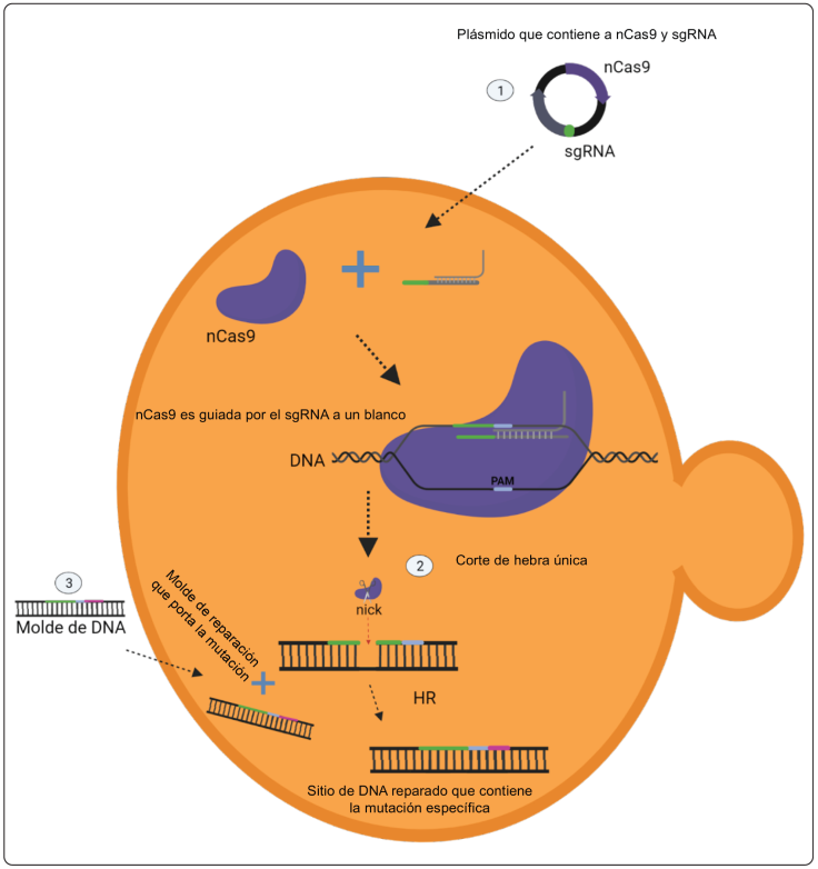 Los grupos de investigación de Jinek (2012) y Gasiunas (2012) evidenciaron que los dominios HNH y RuvC generan nicks en el DNA de manera independiente (Gasiunas et al., 2012; Jinek et al., 2012). El grupo de investigación de Satomura (2017), desarrolló un plásmido que contenía los cassettes de la nCas9, el sgRNA y el DNA donador para introducir un codón de paro en el gen que confiere resistencia a la canavanina (CAN1) en S. cerevisiae (Satomura et al., 2017).