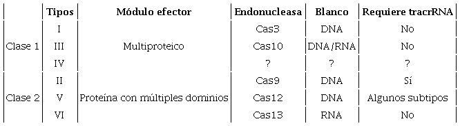 Una pregunta interesante que se hicieron durante la descripción de este mecanismo fue ¿cómo se adquiere y evoluciona el sistema CRISPR? La respuesta tuvo lugar cuando las investigaciones identificaron numerosos componentes del arreglo CRISPR en distintos microorganismos, que presentaban cambios en cada locus entre grupos y especies. Actualmente, los sistemas CRISPR se dividen en dos grandes clases que contienen 6 tipos: clase 1 (tipos I, III y IV) y clase 2 (tipos II, V y VI) (Koonin & Makarova, 2019). Todos los tipos tienen similitudes y diferencias en las proteínas, los crRNAs, o en los mecanismos de adquisición e interferencia (Figura 2 y Tabla I). El sistema tipo I es el más distribuido en las bacterias y se caracteriza por formar un complejo multiproteico unido al crRNA conocido como “complejo asociado a CRISPR de defensa antiviral” o “Cascade”. Este complejo reconoce las secuencias de DNA invasoras y recluta a una nucleasa Cas3 para hacer el corte correspondiente. El sistema tipo III utiliza los complejos multi-Cas -proteína para la interferencia (Csm). En el sistema tipo II, la endonucleasa Cas9 requiere al tracrRNA para complementarse con el crRNA y, al madurar, reconoce la secuencia PAM de tres nucleótidos del DNA blanco (Shmakov et al., 2017). En el sistema V, la proteína efectora característica es Cas12. Al igual que en los sistemas de tipo II, algunos subtipos de sistemas V requieren el tracrRNA para la maduración del crRNA y la interferencia (Makarova et al., 2020). Por último, el sistema tipo VI utiliza la proteína Cas13, una RNAsa que se activa al unirse al RNA blanco y que degrada tanto al RNA blanco como al RNA colateral. A diferencia de otras proteínas Cas, que reconocen un sitio PAM, Cas13 reconoce un sitio de flanqueo del protoespaciador (PFS) en el RNA invasor (Hille et al., 2018; Koonin & Makarova, 2019).