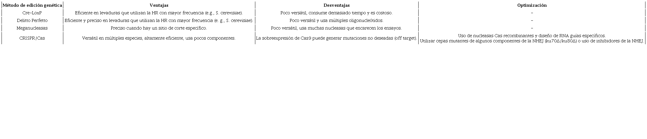 Las primeras investigaciones que usaron ingeniería genética en la levadura Saccharomyces cerevisiae se remontan a principios de 1980, aunque su genoma se terminó de secuenciar en 1996 (Fraczek, Naseeb & Delneri, 2018). La mayoría de las herramientas moleculares de edición genética se han desarrollado en S. cerevisiae por ser de fácil manipulación, su trazabilidad genética y su genoma bien anotado (Wagner & Alper, 2016). Históricamente, la manipulación genética en S. cerevisiae es eficiente debido a su alta tasa de reparación dirigida por identidad (HDR, Homology Directed Repair). La edición genética en S. cerevisiae se realiza a través de la construcción de módulos de DNA generados por PCR y la integración de estos en su genoma mediante diferentes métodos de transformación (Wach, Brachat, Pöhlmann & Philippsen, 1994). Otros métodos de manipulación genética en levaduras que se basan también en la recombinación homóloga son: (i) el sistema de recombinación Cre-Lox, que hace uso de la recombinasa sitio-específica Cre y el reconocimiento de secuencias Lox que flanquean al gen de interés, (ii) el sistema Delitto perfetto, que utiliza de múltiples oligonucleótidos para modificar al gen de interés, y (iii) el empleo de meganucleasas, que son enzimas de restricción con alta especificidad al sitio que reconocen. Sin embargo, estos sistemas tienen desventajas porque la mutagénesis está restringida a la región del cassette integrado (Fraczek et al., 2018).