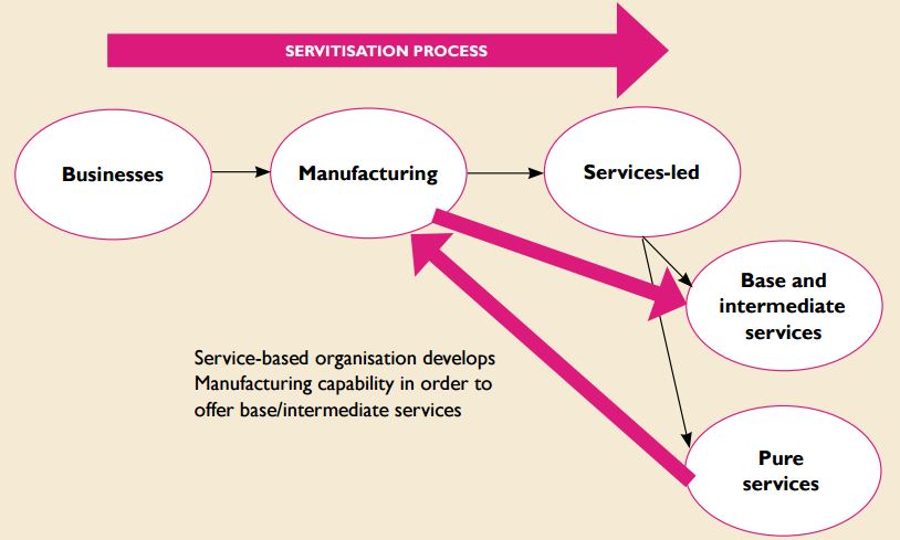 Vandermerwe and Rada (1988) describe how the emphasis for industry has evolved to not differentiate their offerings as goods or services, but a combination of both, describing this as the ‘servitisation of business’. The emerging service dominant logic, discussed by Vargo and Lusch, highlights how the emphasis on value creation is shifting from tangibles to intangibles, as operant resources such as knowledge and skills become the basis for new value creation (2004). In this environment, the view of services is widened and defined as ‘the application of specialised competencies (knowledge and skills) through deeds, processes and performances for the benefit of another entity itself.’ Physical goods have a role in this view, however rather than being a traded commodity, their value is embodied in the service that they provide to the customer. Such a view supports the emergence of the servitised view for product-based organisations. Schmenner has presented a historical perspective to this, arguing that this has been a natural evolution for manufacturing-based services in order to form increasing links with their customers to gain advantage over competitors (2009).