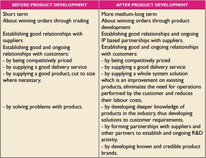 Added value for the customer therefore came from the recognition that system solutions would fill a niche in the market (rather than individual components), and was something that wasn’t being performed by their competitors. It would also significantly reduce their customers’ labour costs by reducing the time for installation. This was the main rationale for moving into product development. They also saw the move into product development as an opportunity to launch a better quality product. Quality is a driver in this marketplace: reputations (and sales) can be destroyed if a customer has a poor product.