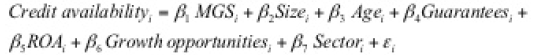 where Credit availability represents the proportion of bank debt over total assets; MGS is a dummy variable taking the value 1 if the firm has finance through a MSG guarantee and 0 otherwise; Size measures the size of the firm by calculating the logarithm of sales; Age is the number of years since the firm was established; Guarantees is a proxy for guarantees put up by the firm, calculated as the ratio of fixed tangible assets over total assets; ROA is the firm’s profitability calculated as the quotient between earnings before interest and taxes and total assets; Growth opportunities is approximated using the variation in sales, (salest-salest-1)/salest-1; finally, the three dummy variables, Industry, Construction and Services, indicate to which sector a firm belongs.