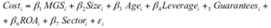 where Cost is measured as the ratio of financing expenses over bank debt; MGS is a dummy variable taking the value 1 if the firm has financing guaranteed by a MGS and 0 otherwise; Leverage is the ratio of short and long term creditors over total assets; the rest of the variables are the same as in model 1. The variable cost includes both the interest rate with the bank borne by the firm and the cost of the MGS guarantee where relevant. The estimation of models (1) ad (2) was performed with ordinary least squares and the errors are robust to heteroskedasticity.