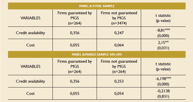 The effects of MGS guarantees on debt conditions for SMEs were examined initially through univariate analysis. Panel A in Table 2 shows the mean values for credit cost and availability for firms guaranteed by MGS and for firms not guaranteed by MGS. For greater robustness, Panel B in the same table gives the results when comparing the sample of guaranteed firms with a control sample made by matching non MGS guaranteed firms of similar characteristics with respect to the sector, assets size, level of sales and number of employees. Statistically significant differences were checked for with a means difference test based on the Student t test. When analyzing the whole sample, the results indicate, as expected, that guaranteed firms have greater access to credit, with 35.6% bank debt of their total liability, versus 24.7% for non guaranteed firms. This finding is significant at 1%. They also bear lower financing costs, 5.5% versus 6.4%, and this difference is statistically significant at 5%. So, the results seem to show better and cheaper access to finance.