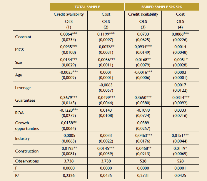 Credit availability (dependent variable) measures the proportion of bank debt over total assets; Cost (dependent variable) is the ratio of financing costs over bank debt; MGS is a dummy variable that takes the value 1 when the firm has obtained financing guaranteed by the MGS; Size is the logarithm of the sales; Age is the number of years since the firm was established; Leverage is the ratio of the total debt over total assets; Guarantees is the ratio of fixed tangible assets over total assets; ROA is the firm’s profitability; Growth opportunities measures the annual variation in sales; Industry is a dummy variable that takes the value 1 when the firm belongs to the industrial sector and 0 otherwise; Construction is a dummy variable that takes the value 1 when the firm belongs to the construction sector and 0 otherwise. All estimations are performed by ordinary least squares. Observations is the number of cases included in the estimation. F is the p-value of the overall significance test. R2 is the coefficient of determination. The stand error consistent with the White heteroskedacity appears in brackets.