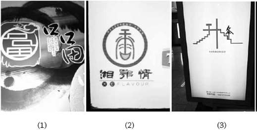 En la primera podemos encontrar el nombre de un restaurante de comida rápida en Shanghai, que es 口口田(kǒukǒu tián, boca boca campo, no tiene significado concreto), cuya articulación hace reticencia a una frase de 口口舌甘(kǒukǒu tián, dulce en cada bocado), con la cual se les hará agua la boca a los comensales cuando entren en el restaurante; así consigue su función publicitaria. Ignorando el fenómeno homófono que presentan estas palabras, podemos darnos cuenta de que existen en la imagen dos transfiguraciones de aquel nombre: en la parte izquierda se colocan desde arriba hacia abajo los tres caracteres 口口田componiendo así otro carácter 富(fù, riqueza), con una nube (la parte superior del círculo) que probablemente será la nube de suerte; en la parte derecha junto con pequeños caracteres se da una visión íntegra del carácter 福(fú, beatitud). Los dos añaden bastantes animaciones a la pared del restaurante. Diseños como éstos de unas transformaciones de caracteres se ven por todas partes en aras de ofrecer un estilo artístico, mostrando vívidamente los caracteres significativos con otros dibujos de paisaje en el fondo, en la decoración de los locales o como simple propaganda.