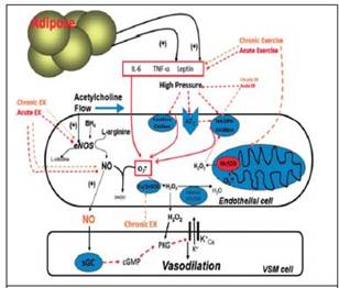 Entre estas se pueden citar las siguientes: disminución de la enzima óxido nítrico sintasa endotelial, reducción del sustrato de Larginina ∕ o de la tetrahidrobiopterina, modificación de la expresión y de la actividad funcional de la enzima óxido nítrico sintasa endotelial, barrido extracelular de ON por especies reactivas de oxígeno; aumento de la producción de vasoconstrictores derivados del endotelio (Figura 1).13