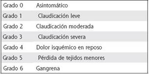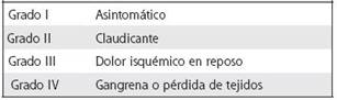 La enfermedad arterial se diagnostica inicialmente con la historia clínica, la inspección y la palpación de pulsos. La técnica más utilizada a nivel mundial es el índice tobillo ∕ brazo (ITB), método que compara presiones sistólicas ipsilaterales en reposo, tomadas a nivel del tobillo (numerador) y a nivel del brazo (denominador). El valor de referencia normal del ITB oscila entre 0,9 y 1,39. El compromiso arterial de la extremidad inferior produce una disminución de la presión arterial sistólica a nivel del tobillo, con respecto a la presión sistólica del brazo. ITB bajos, es decir, ITB < 0,9, indican enfermedad arterial periférica. Cuanto más bajo el índice, la EAP es más severa y se correlaciona con mayor mortalidad cardiovascular.1-3Hay dos clasificaciones para estratificar a los pacientes con isquemia crónica de la extremidad (Cuadros 1 y 2).17