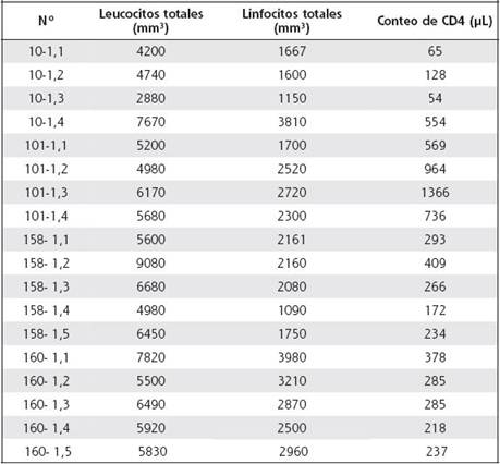 Al evaluar las 144 muestras correspondientes a los 33 pacientes evaluados, los valores de leucocitos en sangre periférica se encontraron entre 1900 y 17850 por mm³, los linfocitos totales se hallaron entre 70 y 5910 por mm³, y los conteos de CD4 oscilaron entre 21 y 1366 por µL. Debido a la cantidad de casos utilizados para la presente investigación, se realizó un cuadro a modo de ejemplo, presentando las triplas de cuatro pacientes específicos. En ellas se puede observar que todos están dentro de los rangos descritos. (Cuadro 1)