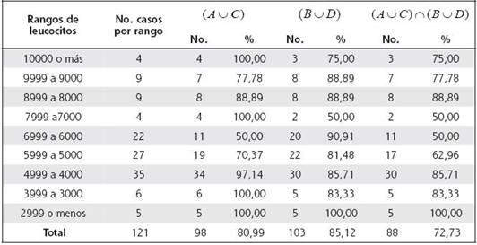 Resultados: La intersección (A ( C) ∩ (B ( D) mostró una efectividad en la predicción de CD4 del 85,71% en el rango de 4999-4000 leucocitos, del 83,33% en el de 3999-3000 y del 100% en el de menos de 3000.