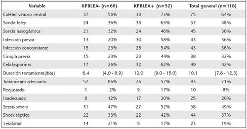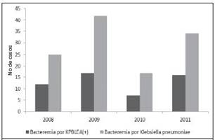 De los factores encontrados que predisponen más a presentar una KPBLEA+, se encontró que este riesgo se aumentaba por las siguientes razones: haber tenido una infección previa por Klebsiella, presentar una infección por Klebsiella concomitante con la bacteremia, haber usado cefalosporinas, haber padecido anemia, y tener colocada una sonda foley (IC95%: 1,1-12,3%).