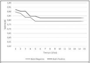 En cuanto a la evolución de los pacientes, los sujetos con KPBLEA+ desarrollaron con mayor frecuencia sepsis severa y shock séptico, pero los pacientes con KPBLEA- mostraron mayor letalidad. Lo anterior se confirma en la estimación de sobrevida a los 30 días de Kaplan - Meier, donde se observa que los pacientes con KPBLEA+ tuvieron una mejor sobrevida a lo largo del periodo estudiado (Figura 3). A pesar de esto, no se logró establecer que estas diferencias fueran estadísticamente significativas, y la presencia de BLEA no incrementó la probabilidad de fallecer.