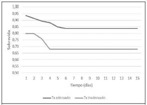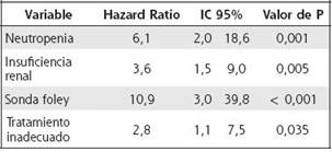 Ahora bien, de los demás factores estudiados, la neutropenia, la insuficiencia renal, la presencia de sonda Foley y la indicación de un tratamiento inadecuado, sí incrementaron la letalidad (IC95%:1,1-39,8%) (Cuadro 4). También, cuando se valoró la sobrevida, en función del tipo de tratamiento, se encontró que los pacientes con tratamiento adecuado presentaron una mayor sobrevida a diferencia de los pacientes con tratamiento inadecuado (Figura 4).