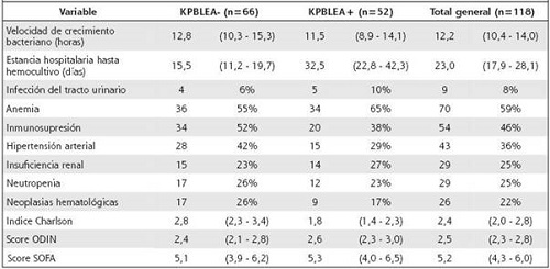 Con respecto a las variables estudiadas, la mayoría de los pacientes se encontraban internados en el servicio de Medicina Interna, en promedio con edades cercanas a los 50 años, todos febriles, con leucocitosis más desviación izquierda, con aumento de reactantes de fase aguda tipo PCR y procalcitonina, y con velocidades de crecimiento rápidas. En cuanto al sitio de origen de la infección, en la mayoría de los pacientes no fue posible identificarlo. De la estancia promedio de los pacientes desde el ingreso hasta el momento de la toma del hemocultivo, esta fue mayor para KPBLEA+.